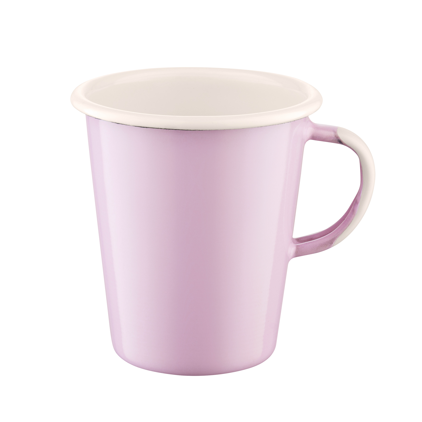 Oryginalny kubek emaliowany stożkowy produkcji firmy Olkuskie Wyroby Emaliowane. Kubek w kolorze lawendowym , obrzeże oraz środek w kolorze białym.