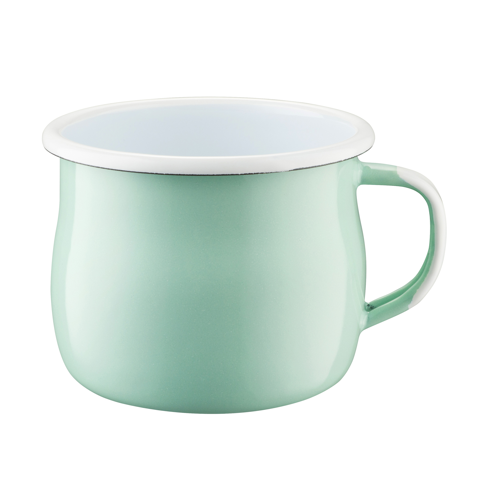 Oryginalny kubek emaliowany wypukły produkcji firmy Olkuskie Wyroby Emaliowane. Garnuszek w kolorze miętowym , obrzeże oraz środek w kolorze białym.